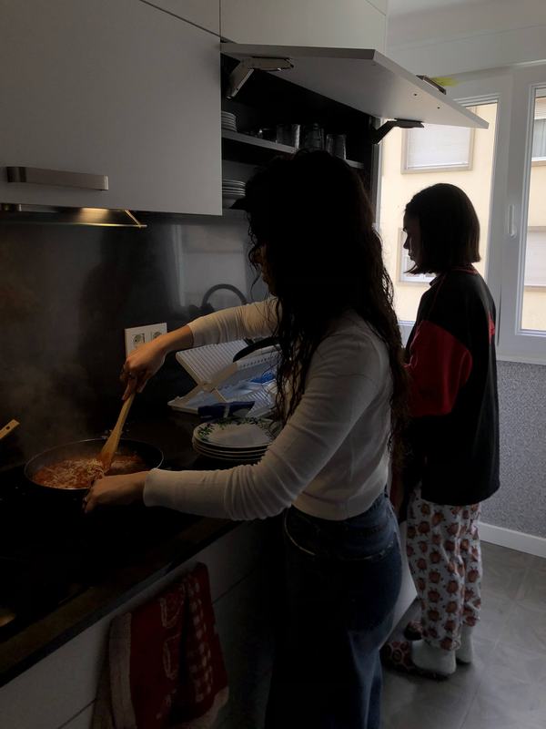 Estudiantes valencianas viviendo en Santiago de Compostela durante el curso 2021/2022 cocinando pasta con tomate.